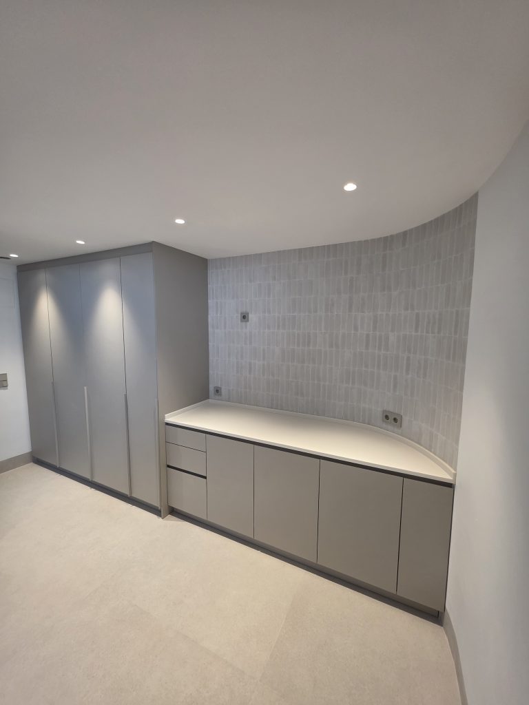 Encimera con emparchado e Isla en Solid Surface Krion blanco K-life, espectacular la combinación de antracita y blanco